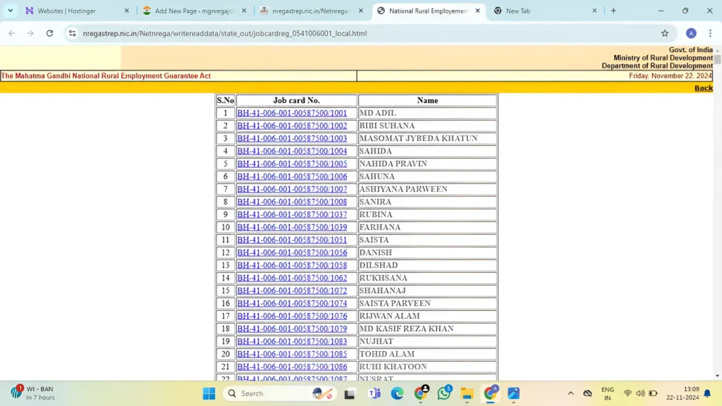 आपके क्षेत्र के सभी जॉब कार्ड की सूची प्रदर्शित होगी। वहां से आप अपना Job Card number ढूंढ सकते हैं और क्लिक करके विवरण देख सकते हैं।