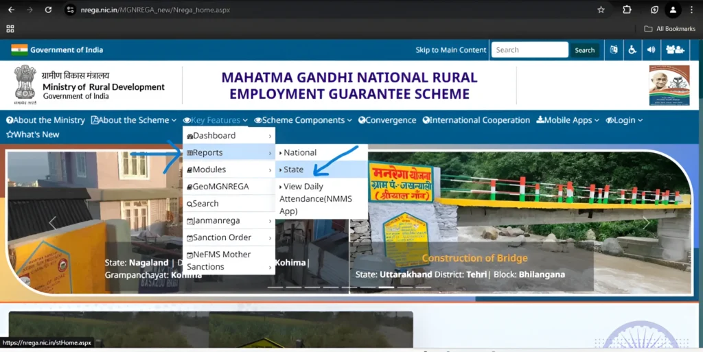 पहले MGNREGA की आधिकारिक वेबसाइट पर जाएं। यह वेबसाइट MGNREGA संबंधित रिपोर्ट और डेटा प्राप्त करने का आधिकारिक प्लेटफॉर्म है। होमपेज पर Key Features > Reports > State Reports पर जाएं।