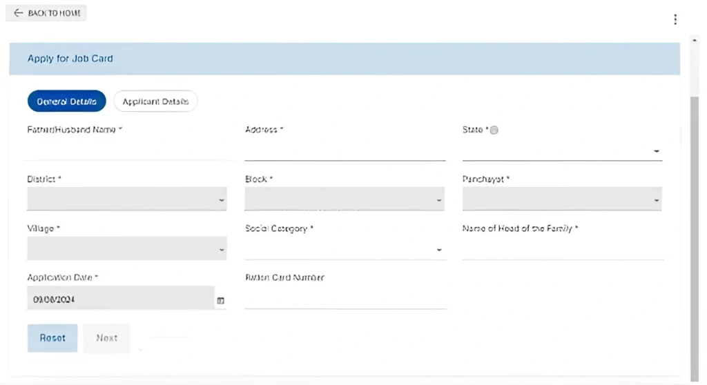 अब आपको आवेदन पृष्ठ पर ले जाया जाएगा। यहां सभी आवश्यक जानकारी भरें, जो NREGA Job Card Online & Offline आवेदन के लिए जरूरी है।