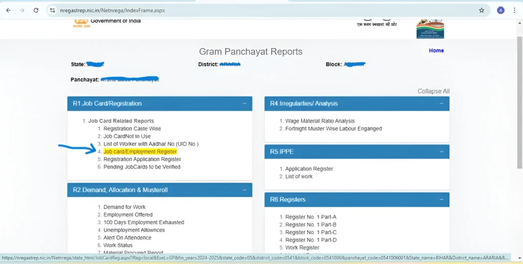 Gram Panchayat Report सेक्शन के तहत R.1 Job Card/Registration श्रेणी में 4. Job Card/Employment Register पर क्लिक करें और वहां NREGA Odisha Job Card List 2025 को एक्सेस करें।